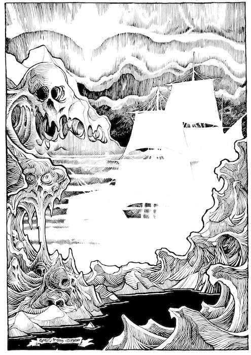 Ron Turner: Greg was in the first Slow Death Funnies and then became a continuing contributor. He drew and lettered our first Slow Death cover and gave Last Gasp its first logo, a skull with its eyeballs and tongue hanging out. He also contributed a lot to Skull comics and to other Slow Death ones we did later on. Greg also drew artwork for coloring books for this company called Bellerophon. Gilbert Shelton did some of those, too. Bellerophon did storylines that were fabulous, with Greg doing pirate images and old sailing ships that are drawn to perfection. It would be lovely to color them in.