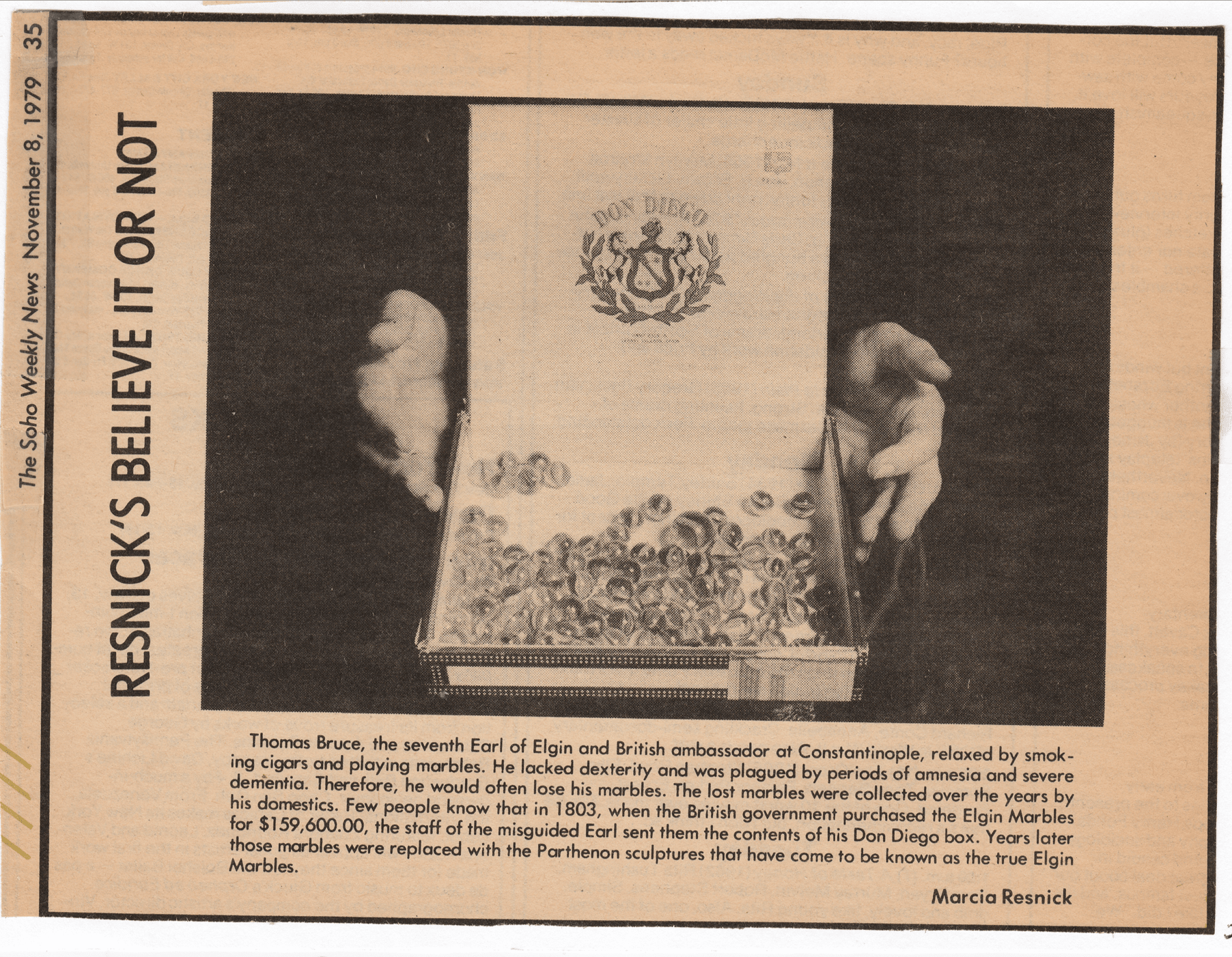 In the years 1979-1982, Marcia had a regular photo feature in the SoHo Weekly News, called “Resnick’s Believe-It-or-Not.” When the real Ripley’s-Believe-It-Or-Not, unbelievably, sent a cease-and-desist order, she changed the name to “Resnick’s Believe It.” By then, she was well on her way to completing the “Bad Boys” project.